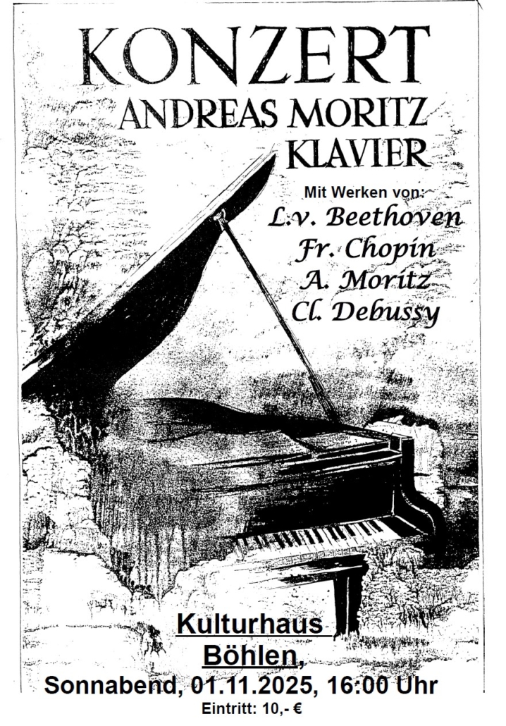 mit Werken von: Ludwig van Beethoven, Frederic Chopin, Andreas Moritz und Claude Debussy Das Konzert findet im Zimmer 12 statt. Eintrittskarten zum Preis von 10,00 € können nur unmittelbar vor dem Konzert erworben werden.